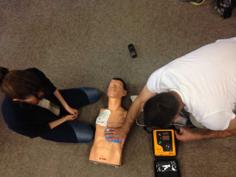 Loïc équipe un mannequin d'un défibrillateur