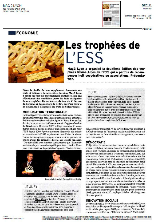 Lors de la deuxième édition des trophées Rhône-Alpes de l’économie sociale et solidaire, organisée par Mag2 Lyon le 3 décembre dernier, Dynamique Hydro a été récompensée dans la catégorie « Coup de cœur ».